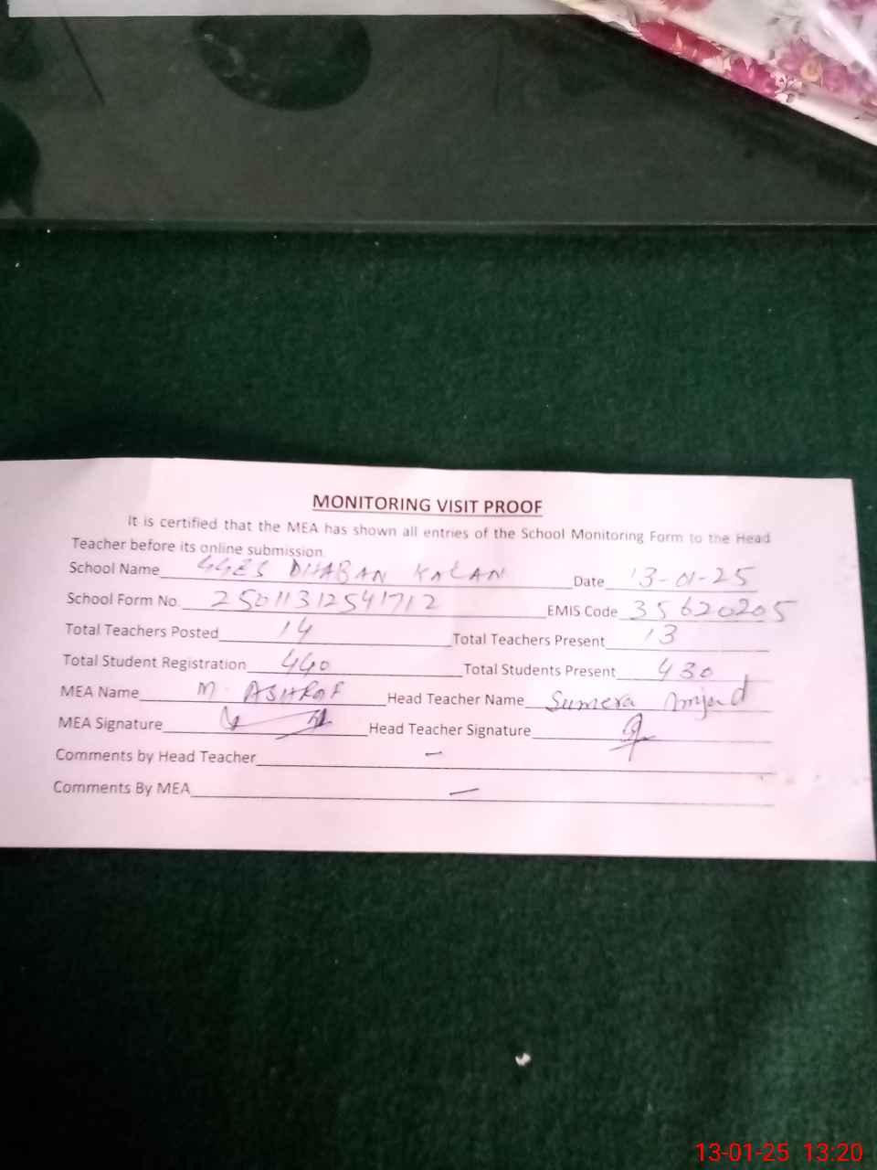 | Attendance Register | Head Teacher | MEA with School | Visit Proof |