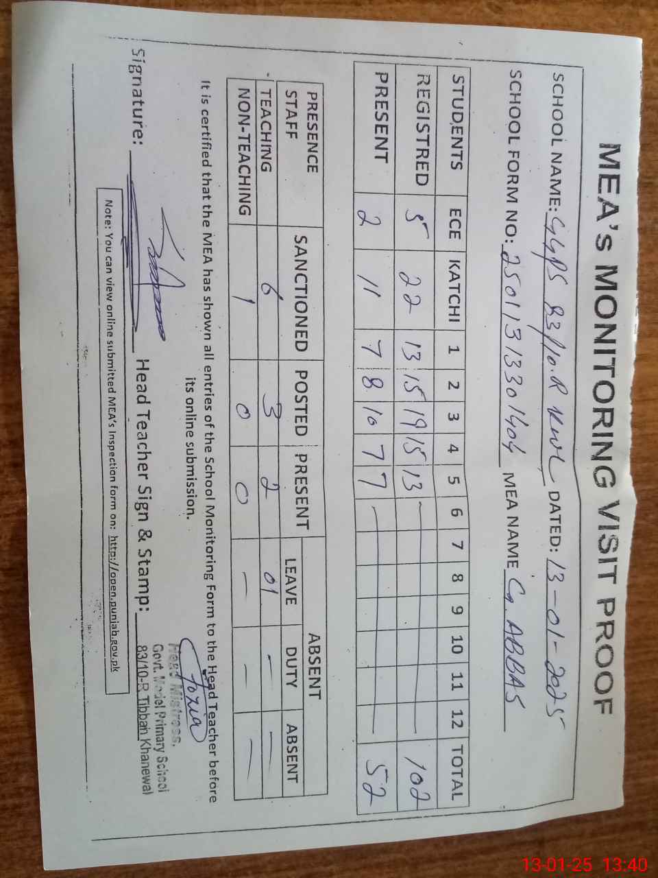 | EMIS Code: 36420427 | Name of School: GGPS 83/10-R, KHANEWAL | |||