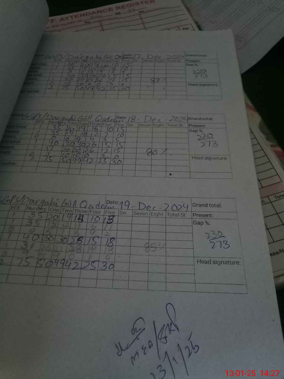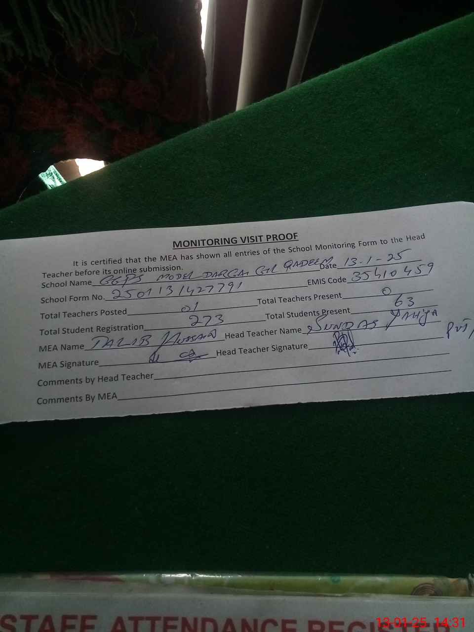 | Attendance Register | Head Teacher | MEA with School | Visit Proof |
