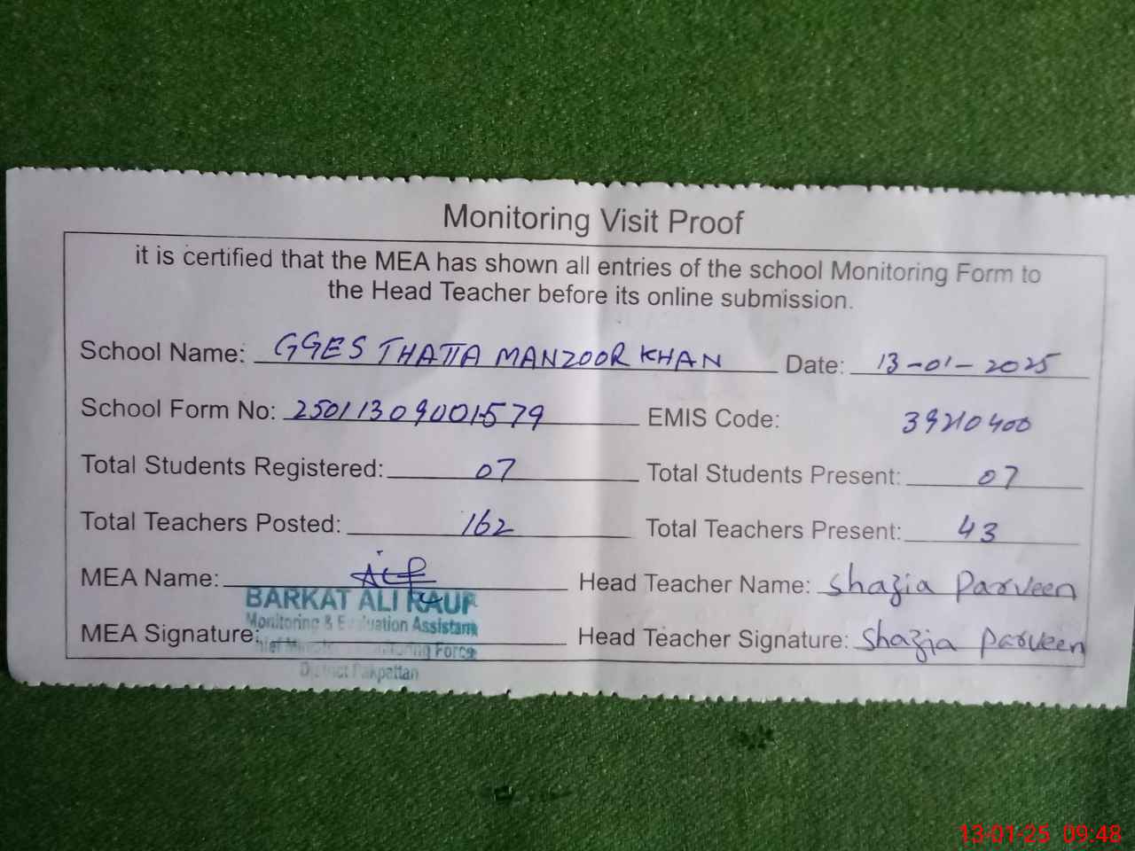 | Attendance Register | Head Teacher | MEA with School | Visit Proof |