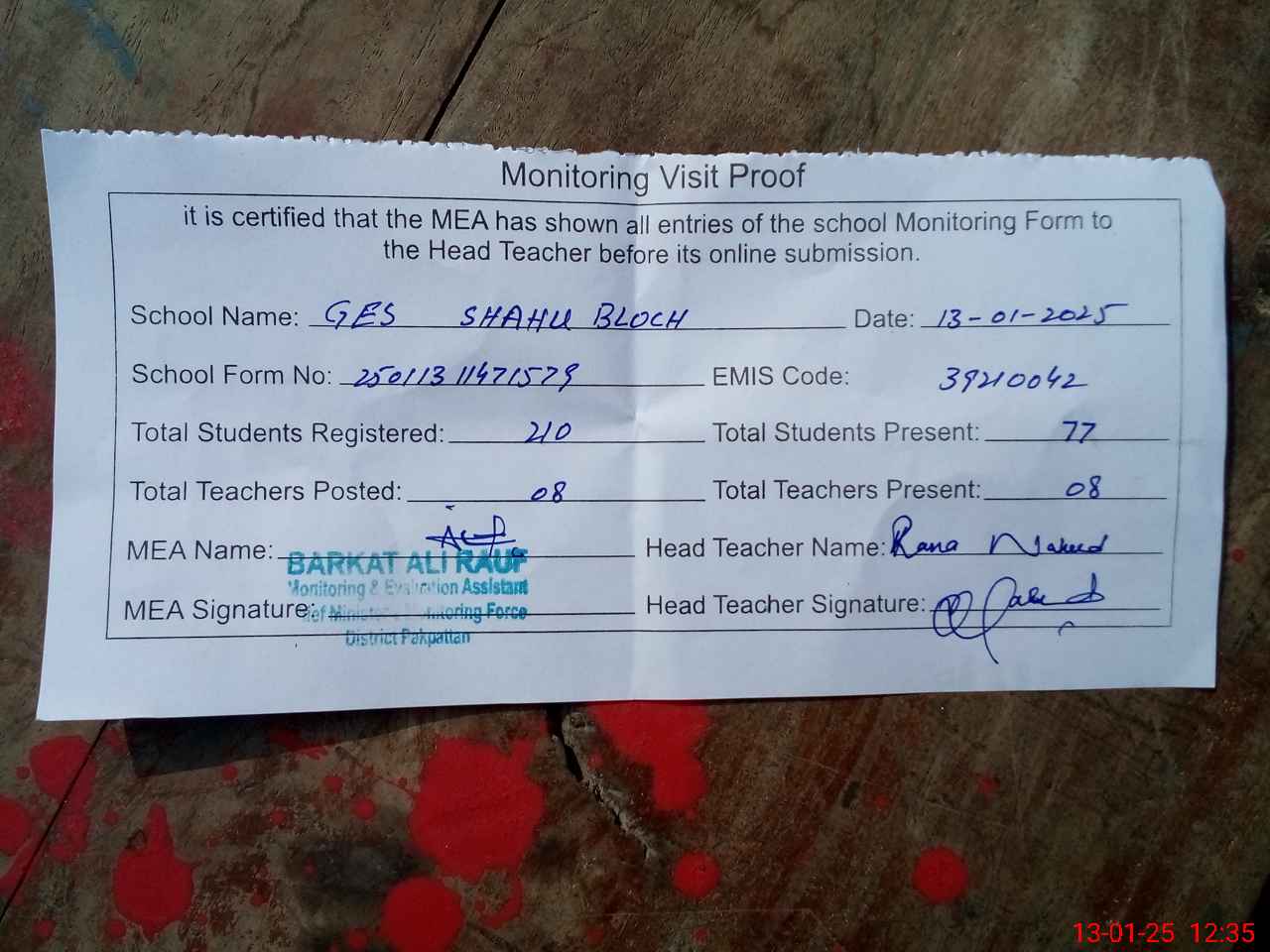 | Attendance Register | Head Teacher | MEA with School | Visit Proof |