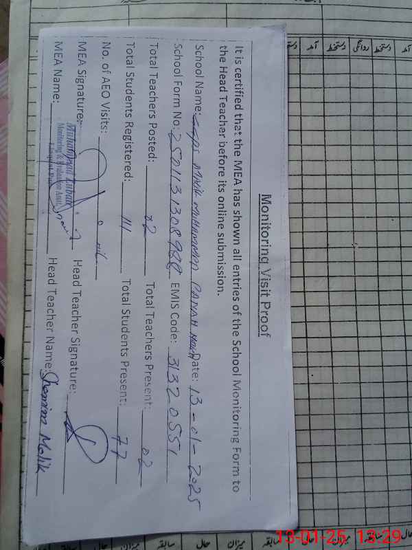 | Attendance Register | Head Teacher | MEA with School | Visit Proof |