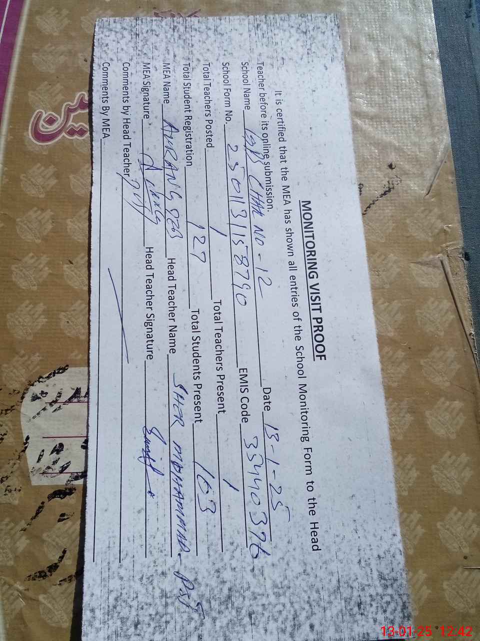| Attendance Register | Head Teacher | MEA with School | Visit Proof |