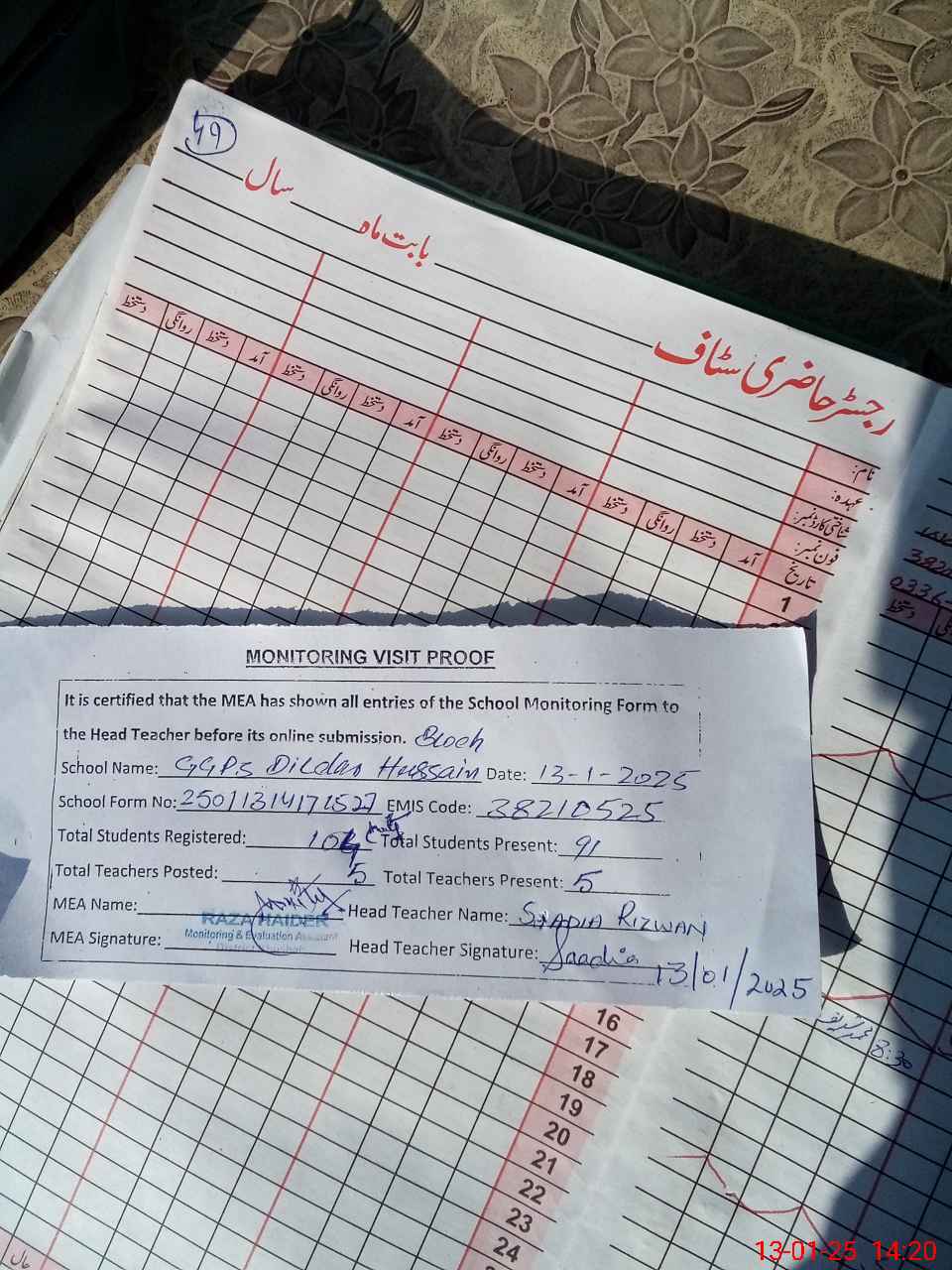 | Attendance Register | Head Teacher | MEA with School | Visit Proof |