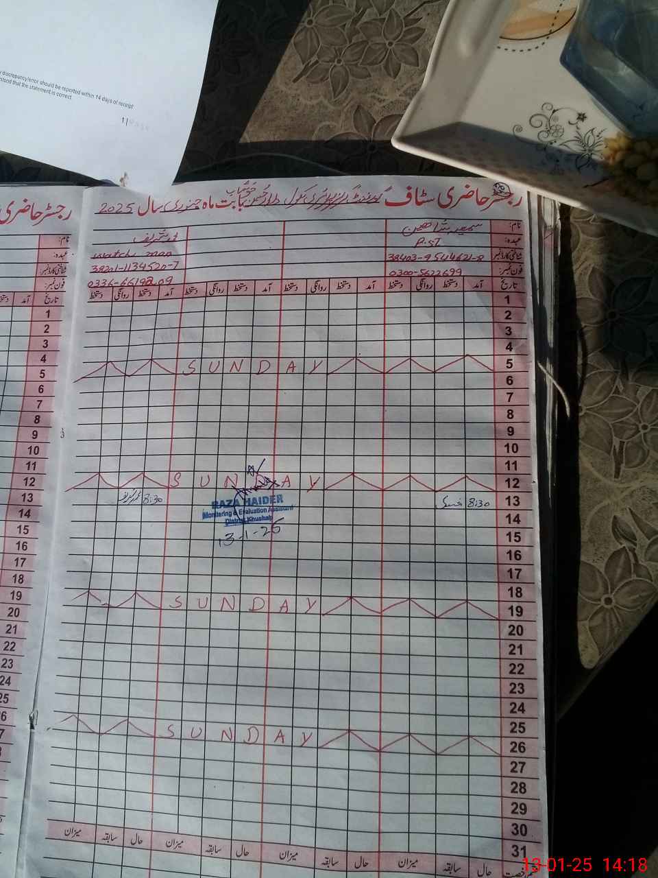 | Name: Sa**** Ri**** Designation: (School Headmaster's/Headmistress's) PST Phone/Cell Number: 03**** |