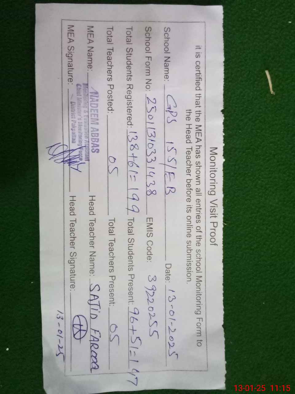 | Attendance Register | Head Teacher | MEA with School | Visit Proof |