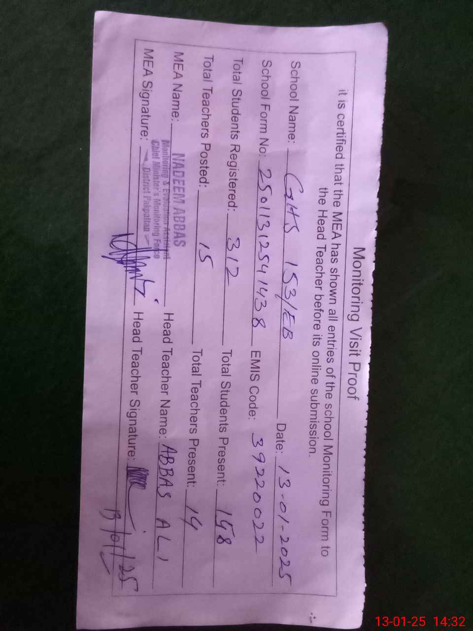 | Attendance Register | Head Teacher | MEA with School | Visit Proof |