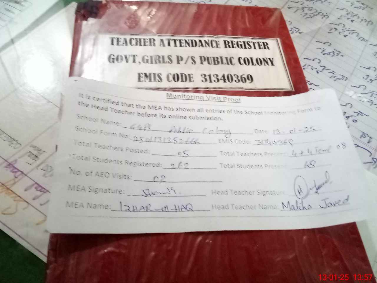 | Attendance Register | Head Teacher | MEA with School | Visit Proof |