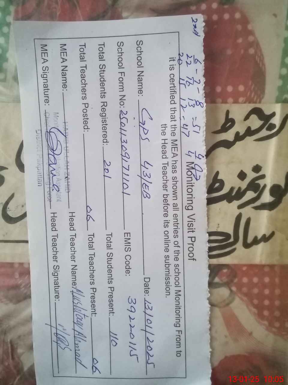 | Name: MAS**** AZ**** Designation: (School Headmaster's/Headmistress's) EST Phone/Cell Number: 03**** |