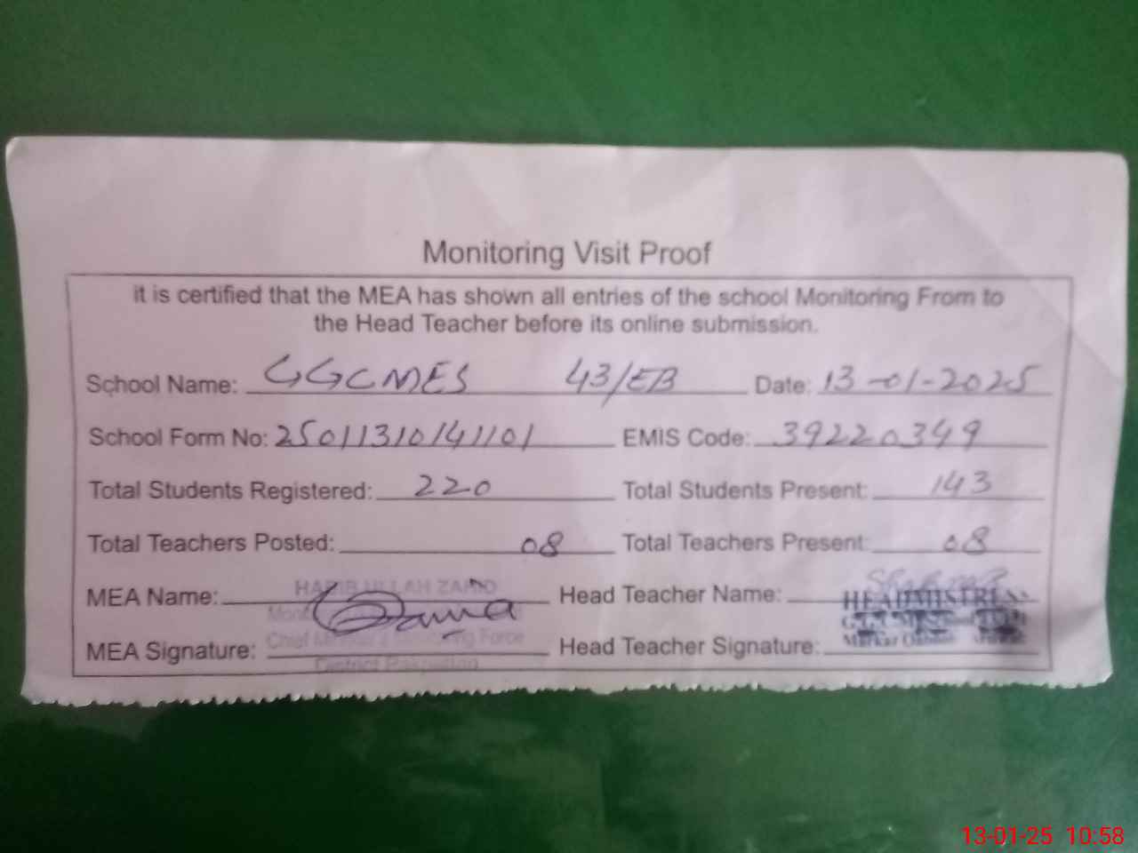 | EMIS Code: 39220349 | Name of School: GGCMES 43 EB P/O KOT KHUDA BUKHSH | |||