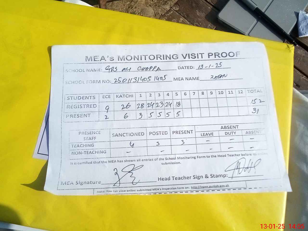 | Attendance Register | Head Teacher | MEA with School | Visit Proof |