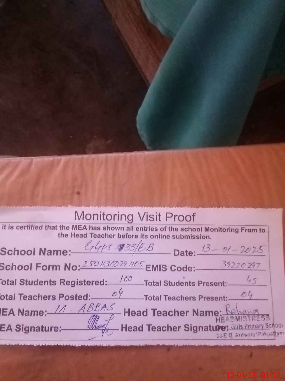 | Attendance Register | Head Teacher | MEA with School | Visit Proof |