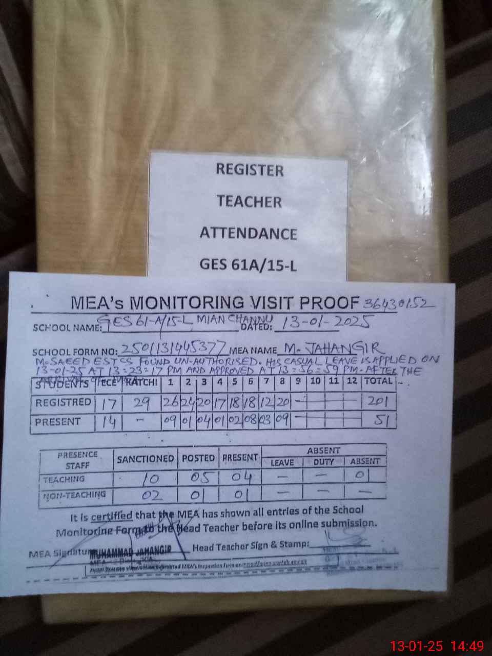 | EMIS Code: 36430152 | Name of School: GES 61-A/15-L, MIAN CHANNU | |||