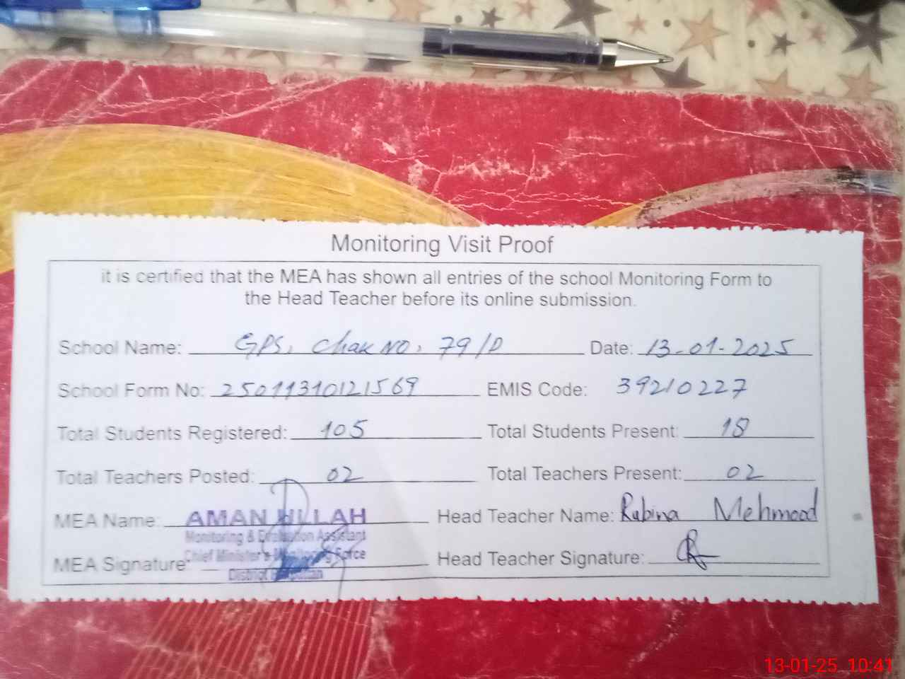 | Attendance Register | Head Teacher | MEA with School | Visit Proof |