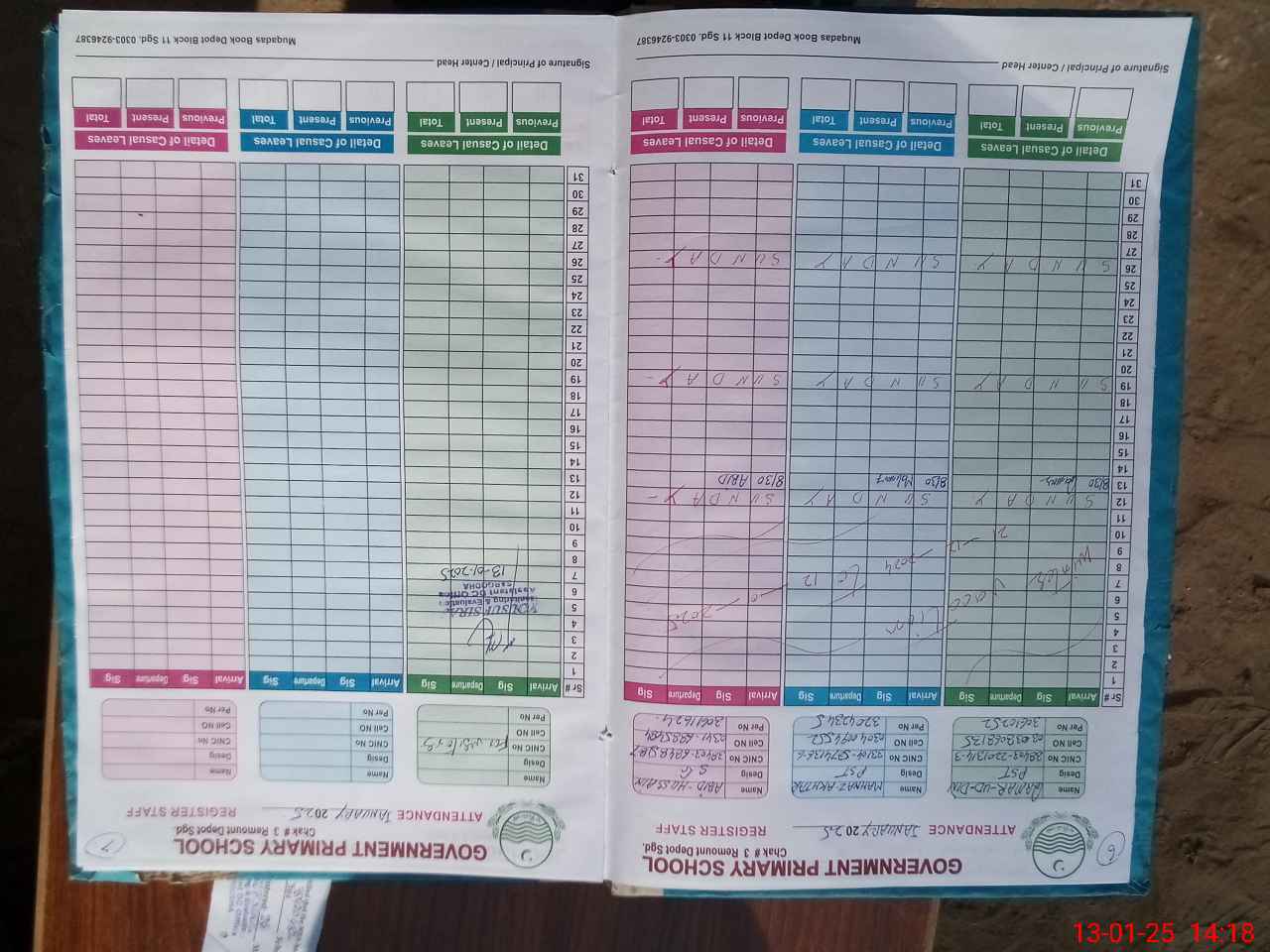 | CNIC | Full Name | Designation | R/C | Absence during last cal. month |