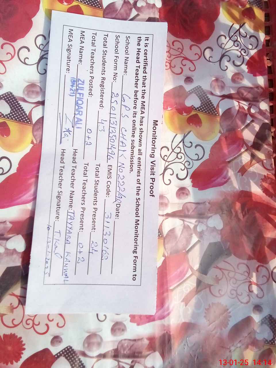 | EMIS Code: 31130162 | Name of School: GPS CHAK NO.222/9-R | |||