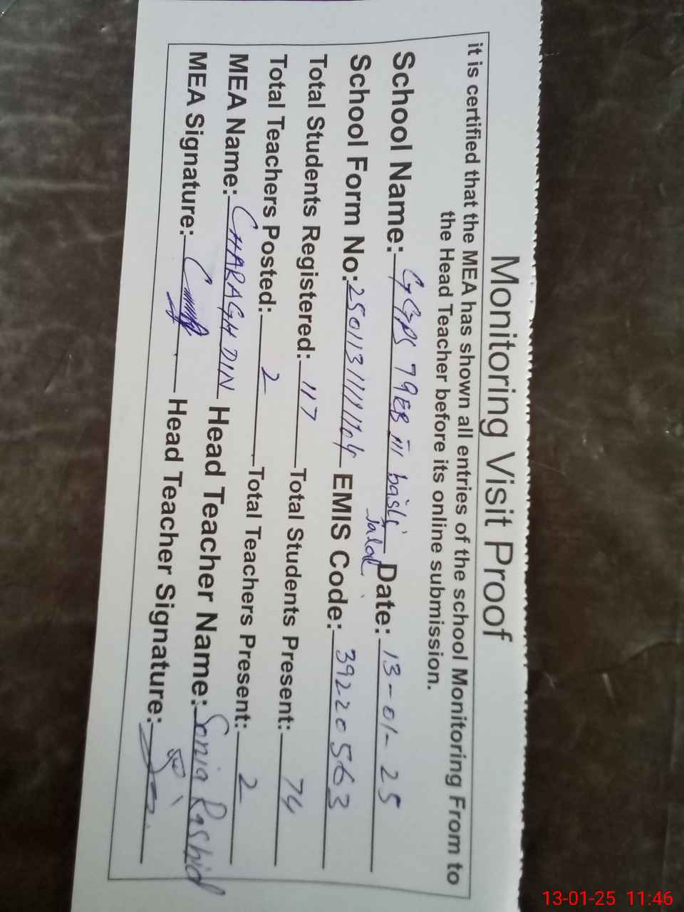 | Attendance Register | Head Teacher | MEA with School | Visit Proof |