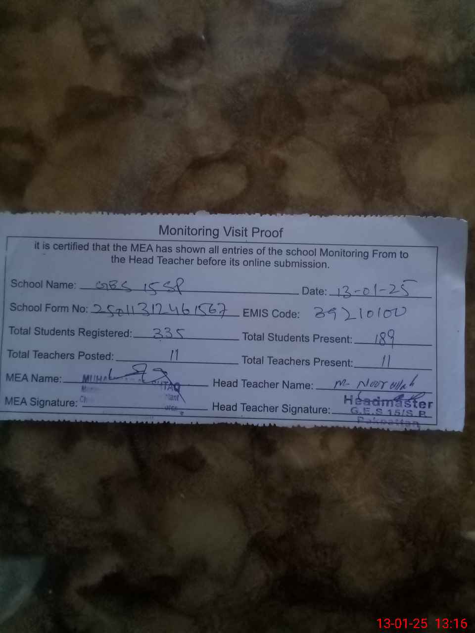 | EMIS Code: 39210100 | Name of School: GES 15/SP P.O PAKPATTAN | |||