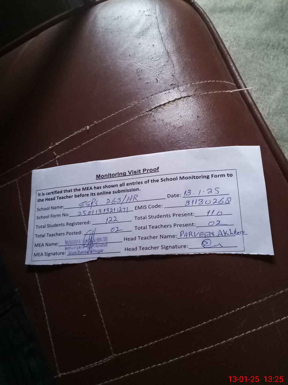 | Attendance Register | Head Teacher | MEA with School | Visit Proof |