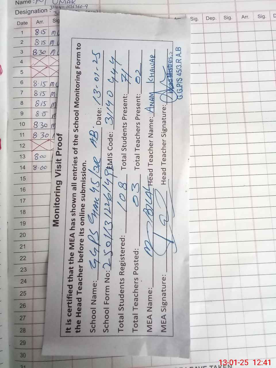 | Attendance Register | Head Teacher | MEA with School | Visit Proof |