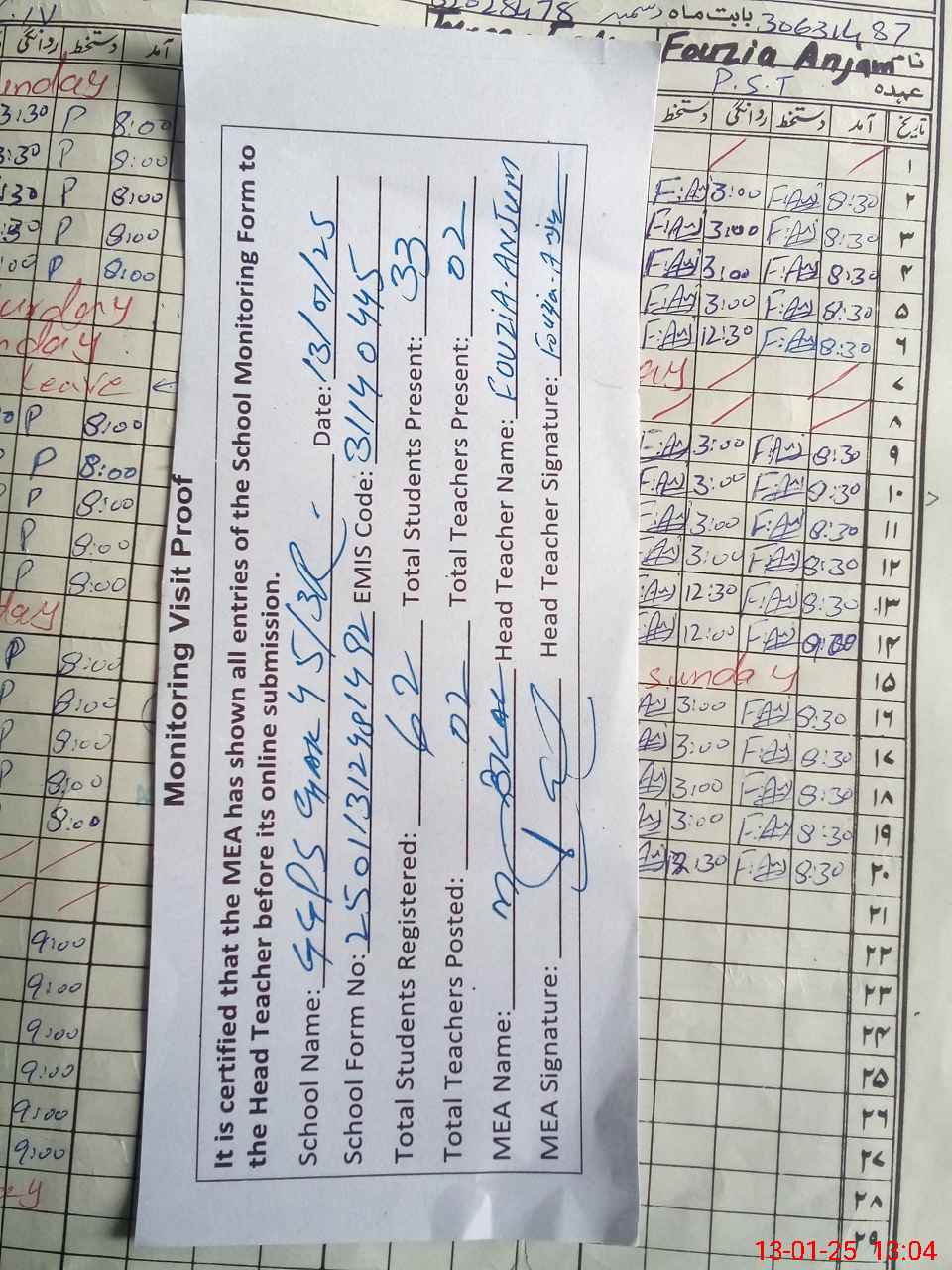 | Attendance Register | Head Teacher | MEA with School | Visit Proof |