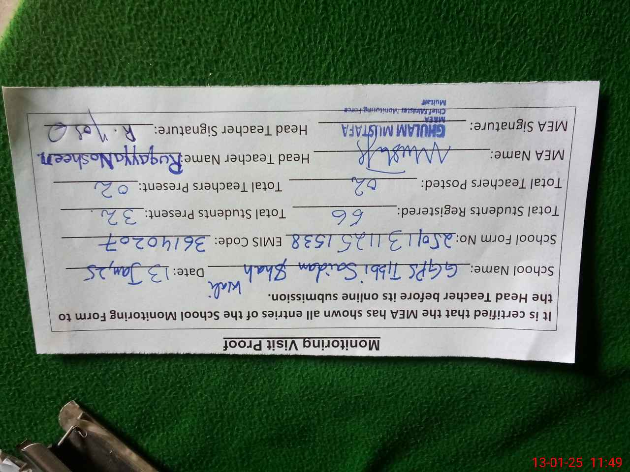 | Monitoring Date: 13-01-2025 | Start Time: 13-01-2025 11:25 AM | End Time: 13-01-2025 11:52 AM | Name of MEA: Gh**** Mu**** | |