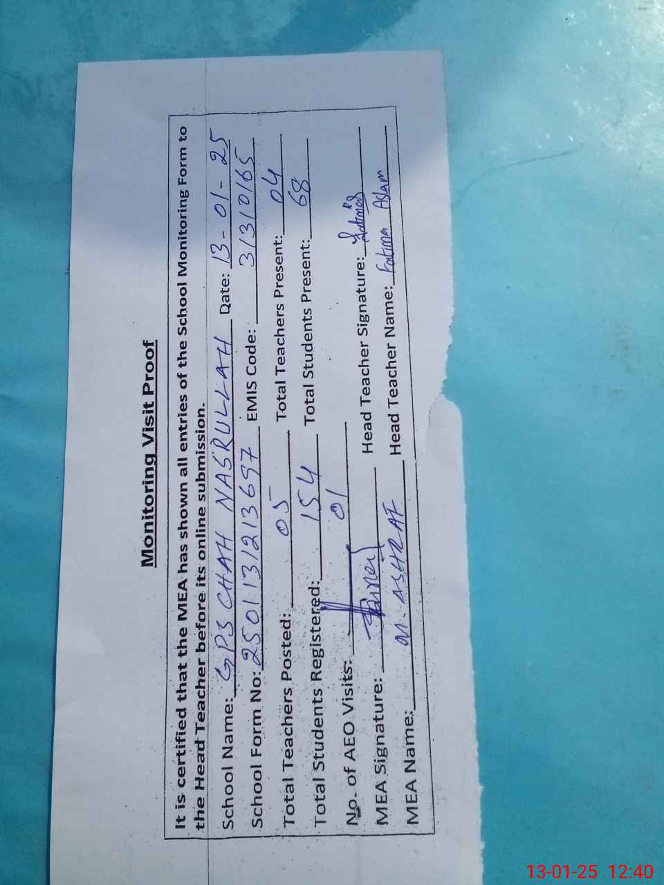 | Attendance Register | Head Teacher | MEA with School | Visit Proof |