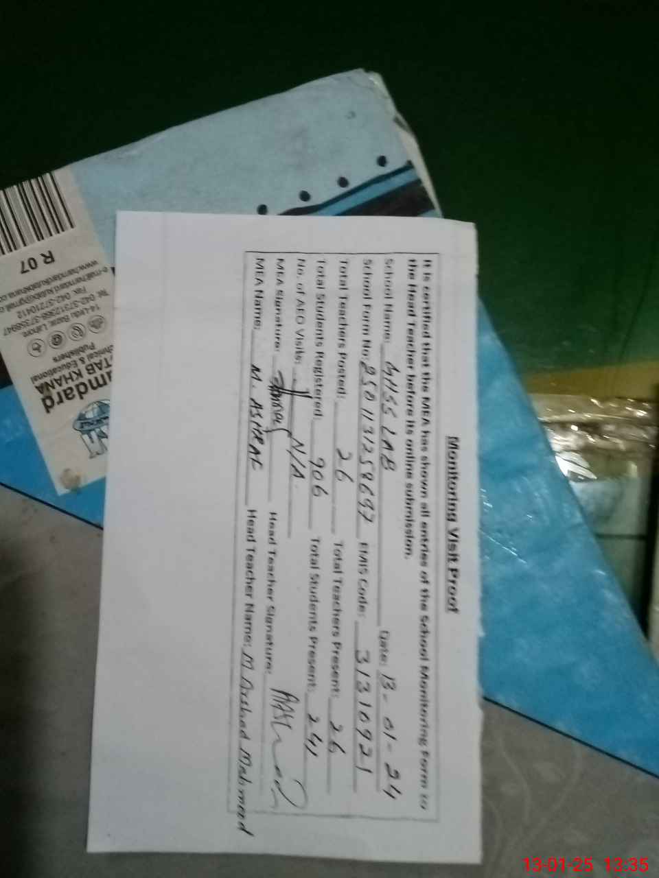 | Attendance Register | Head Teacher | MEA with School | Visit Proof |