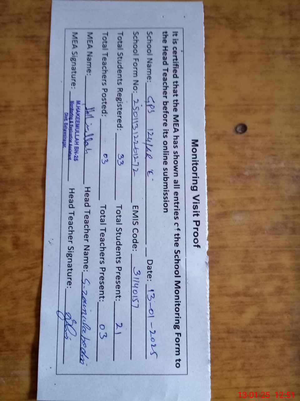| EMIS Code: 31140157 | Name of School: GPS CHAK NO 124/6-R E | |||