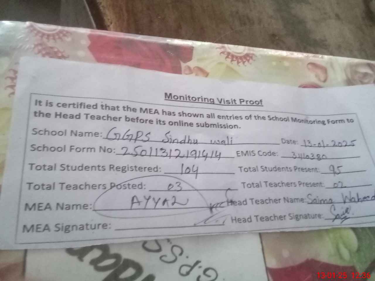 | Attendance Register | Head Teacher | MEA with School | Visit Proof |