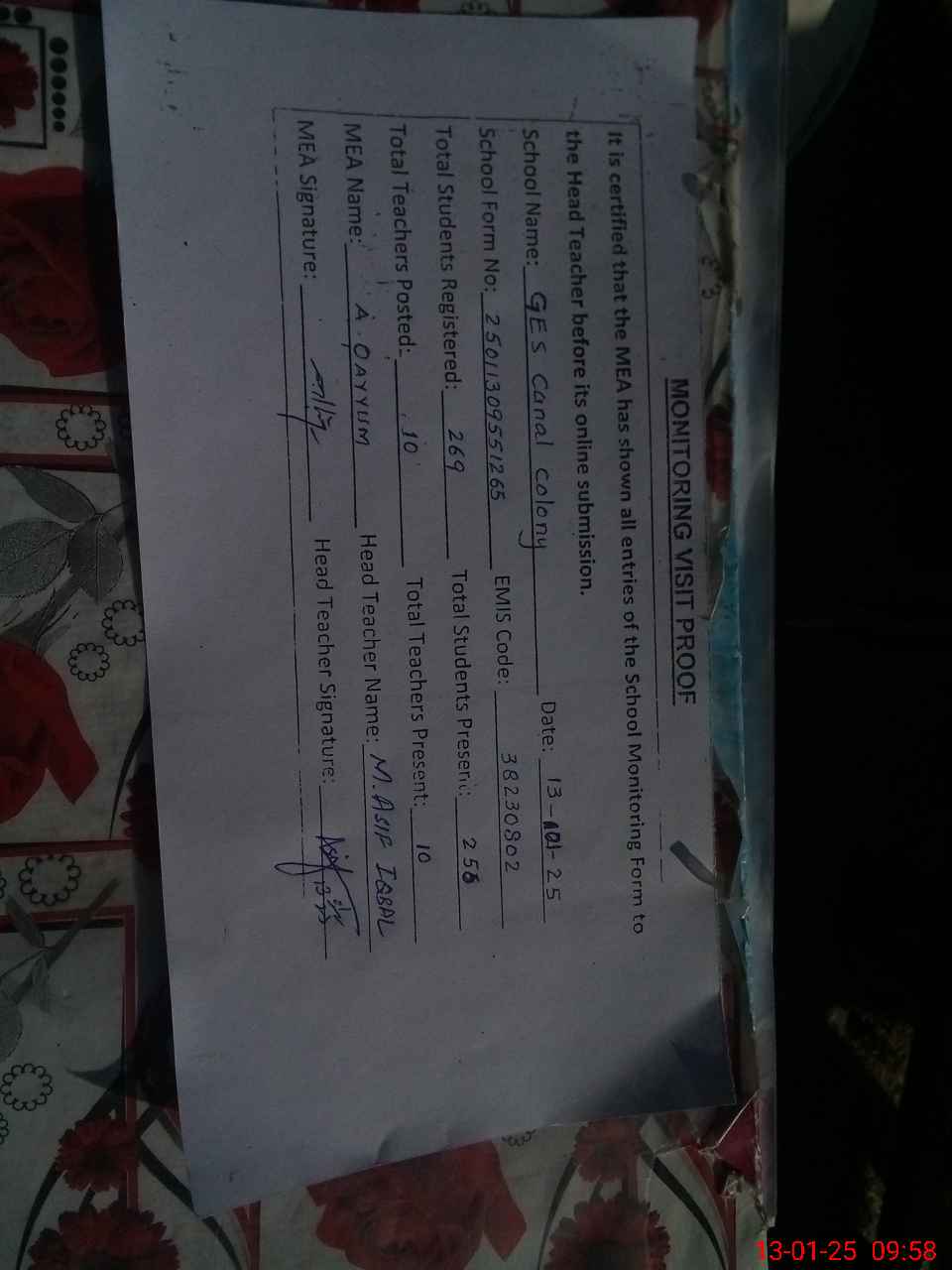 | Attendance Register | Head Teacher | MEA with School | Visit Proof |