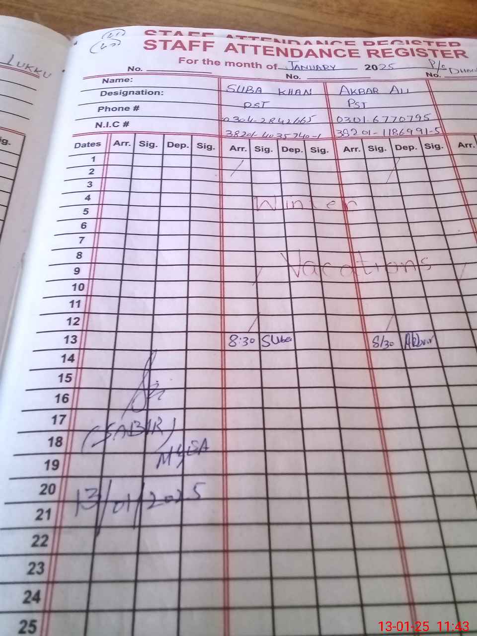 | CNIC | Full Name | Designation | R/C | Absence during last cal. month |