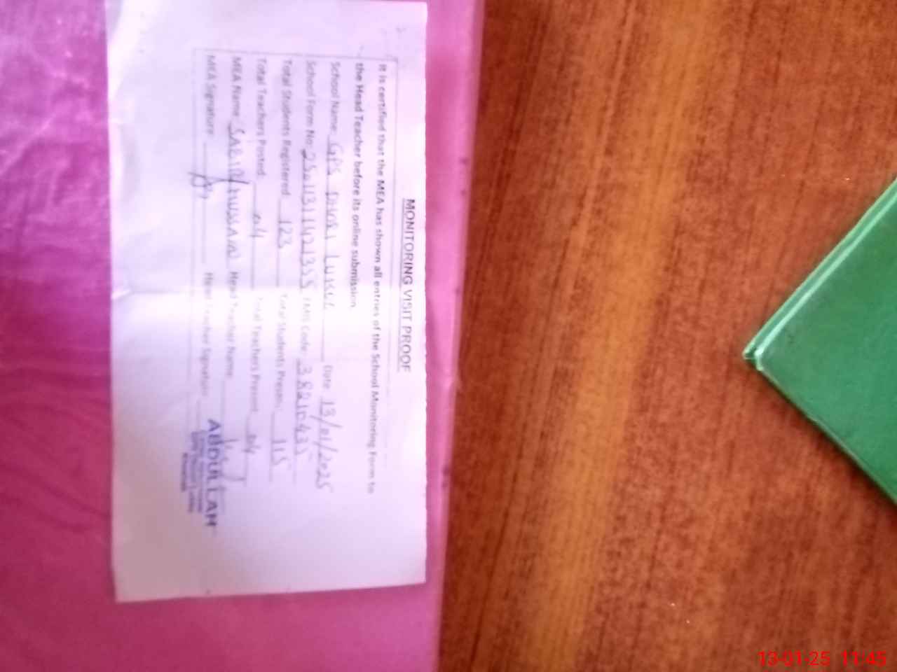 | Attendance Register | Head Teacher | MEA with School | Visit Proof |