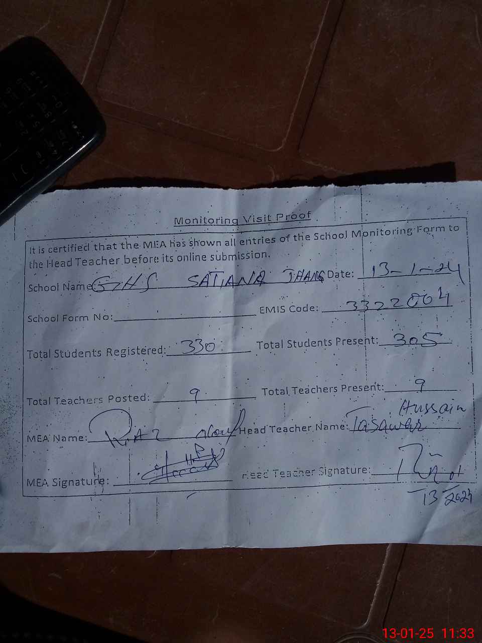 | Attendance Register | Head Teacher | MEA with School | Visit Proof |