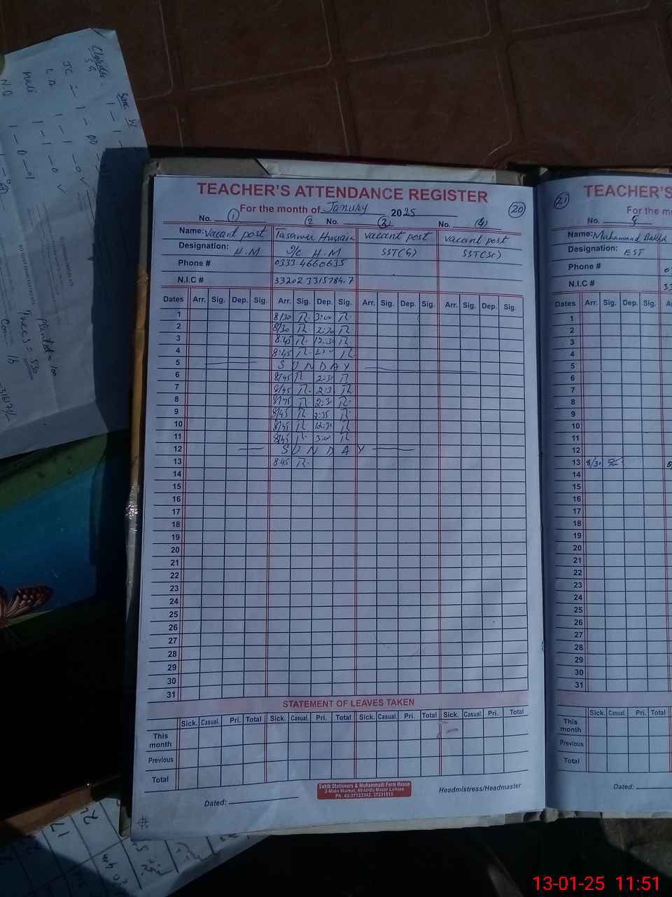 | CNIC | Full Name | Designation | R/C | Absence During Last Calender Month |