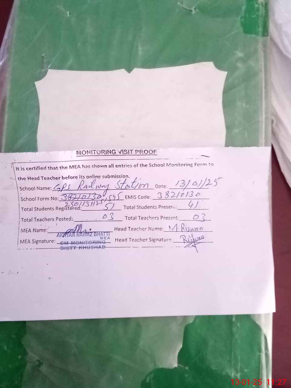| Attendance Register | Head Teacher | MEA with School | Visit Proof |