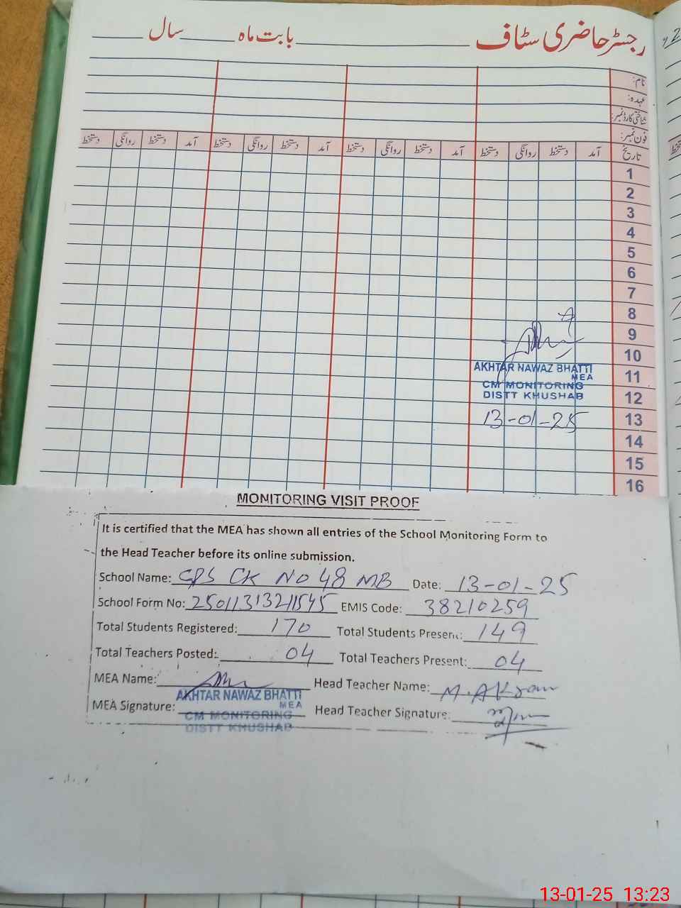 | Attendance Register | Head Teacher | MEA with School | Visit Proof |
