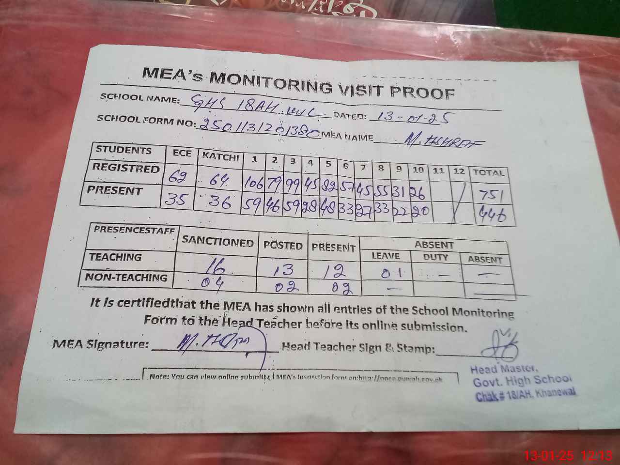 | Attendance Register | Head Teacher | MEA with School | Visit Proof |