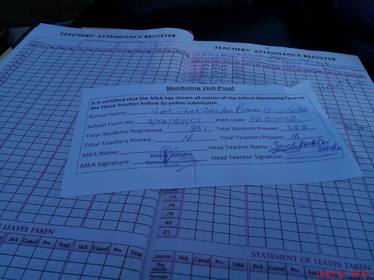 | Attendance Register | Head Teacher | MEA with School | Visit Proof |