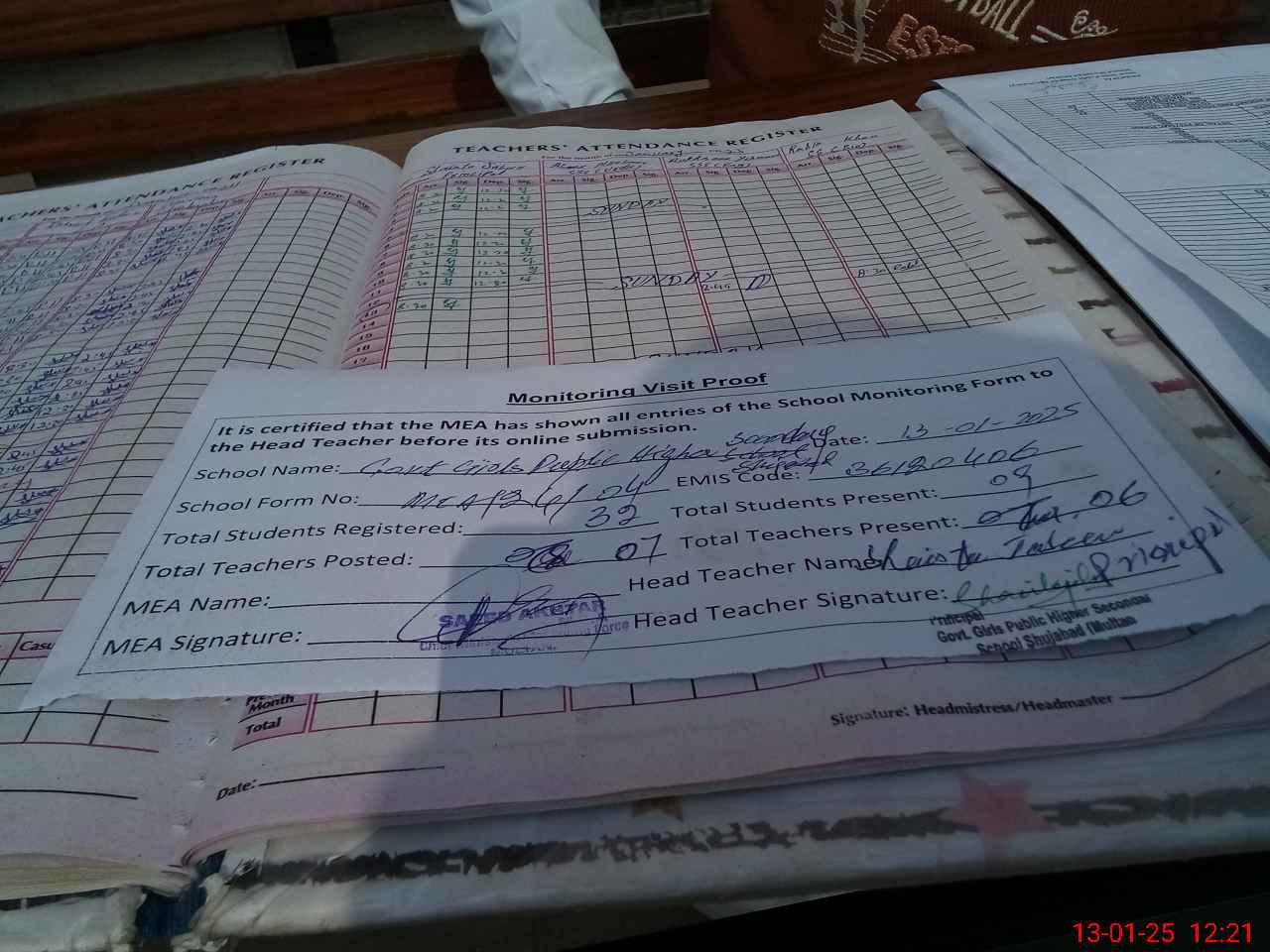 | Attendance Register | Head Teacher | MEA with School | Visit Proof |