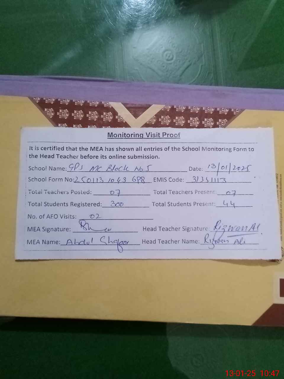 | Attendance Register | Head Teacher | MEA with School | Visit Proof |