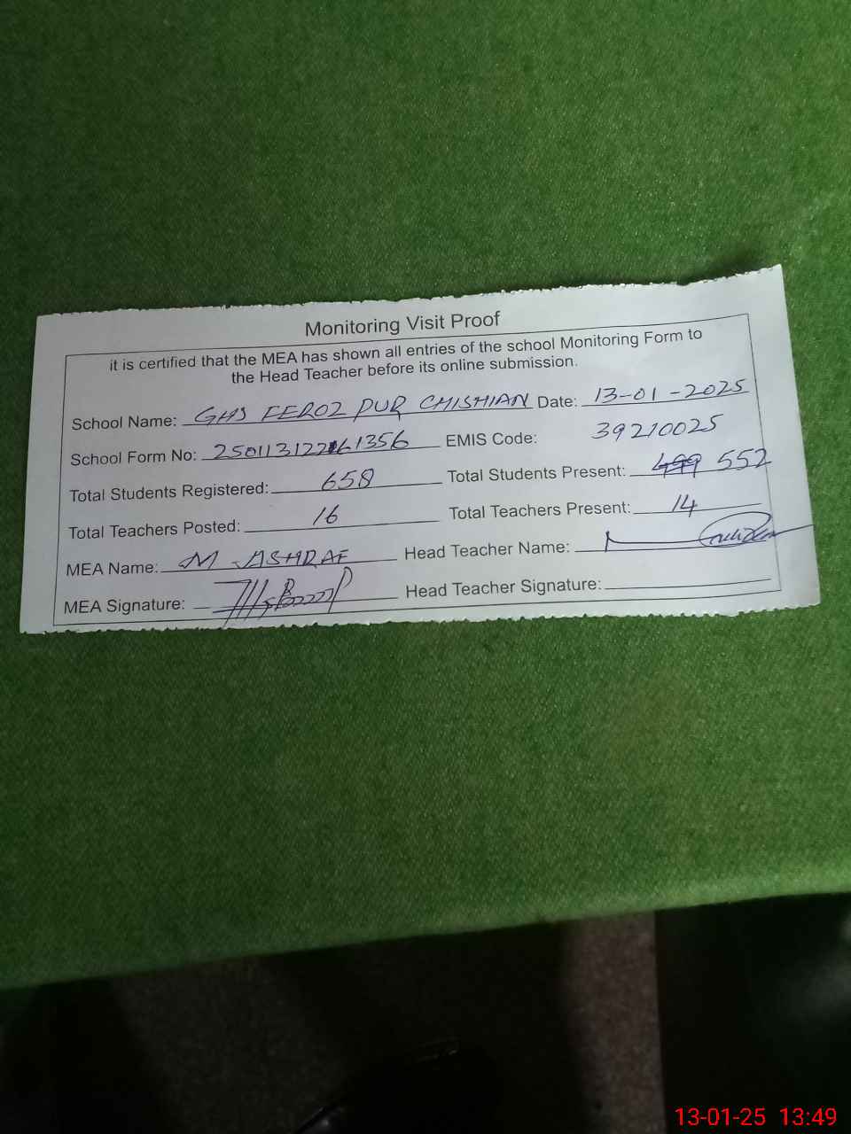 | Attendance Register | Head Teacher | MEA with School | Visit Proof |