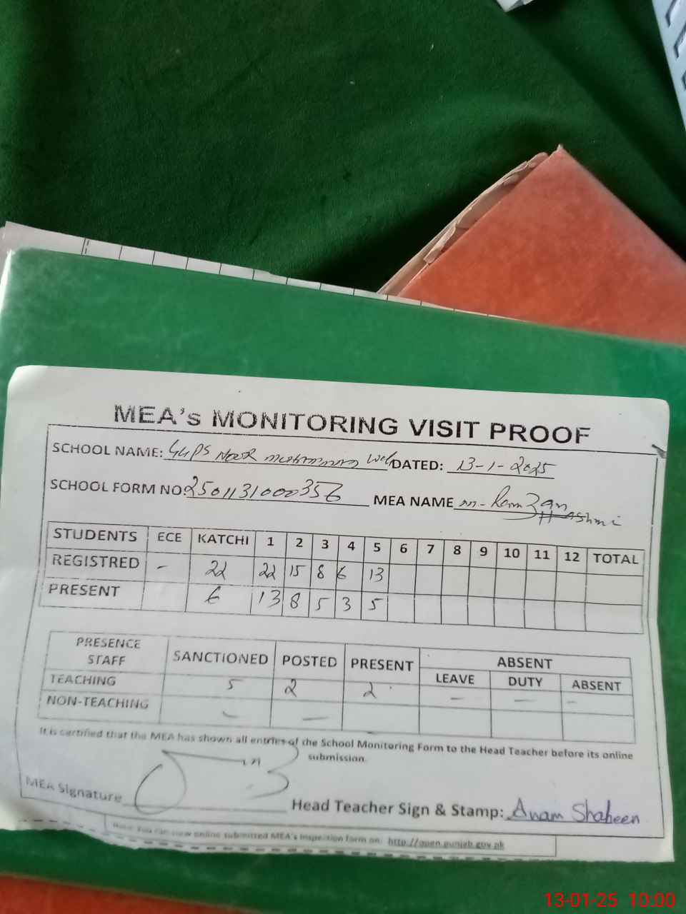 | Attendance Register | Head Teacher | MEA with School | Visit Proof |