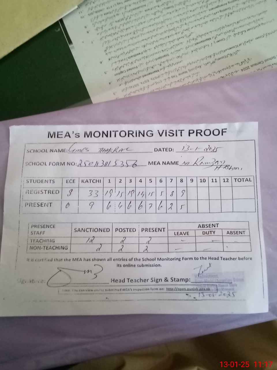 | Attendance Register | Head Teacher | MEA with School | Visit Proof |