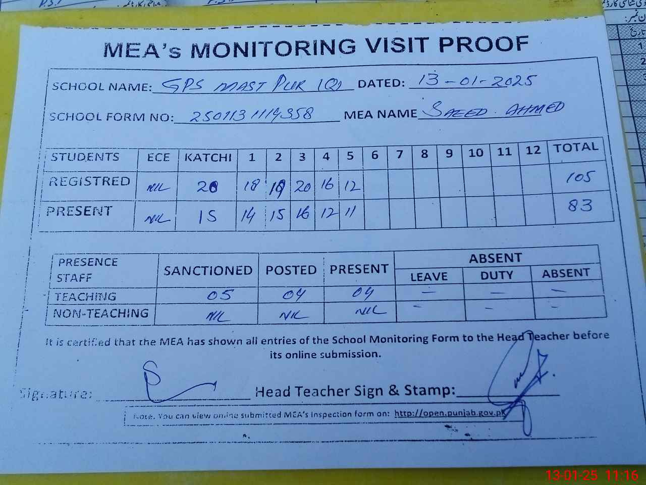 | Attendance Register | Head Teacher | MEA with School | Visit Proof |