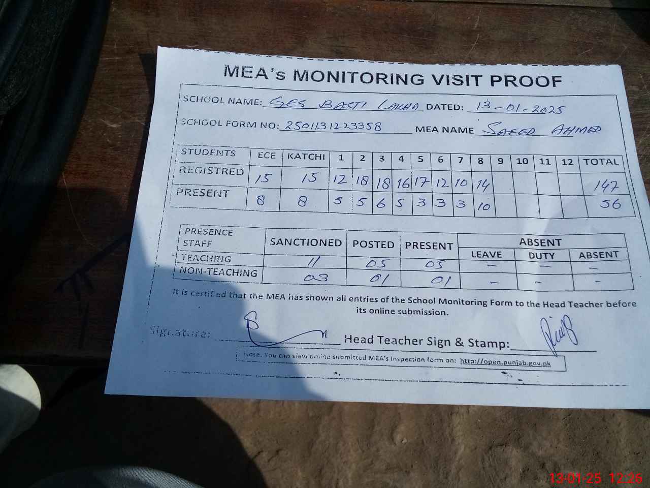 | Attendance Register | Head Teacher | MEA with School | Visit Proof |