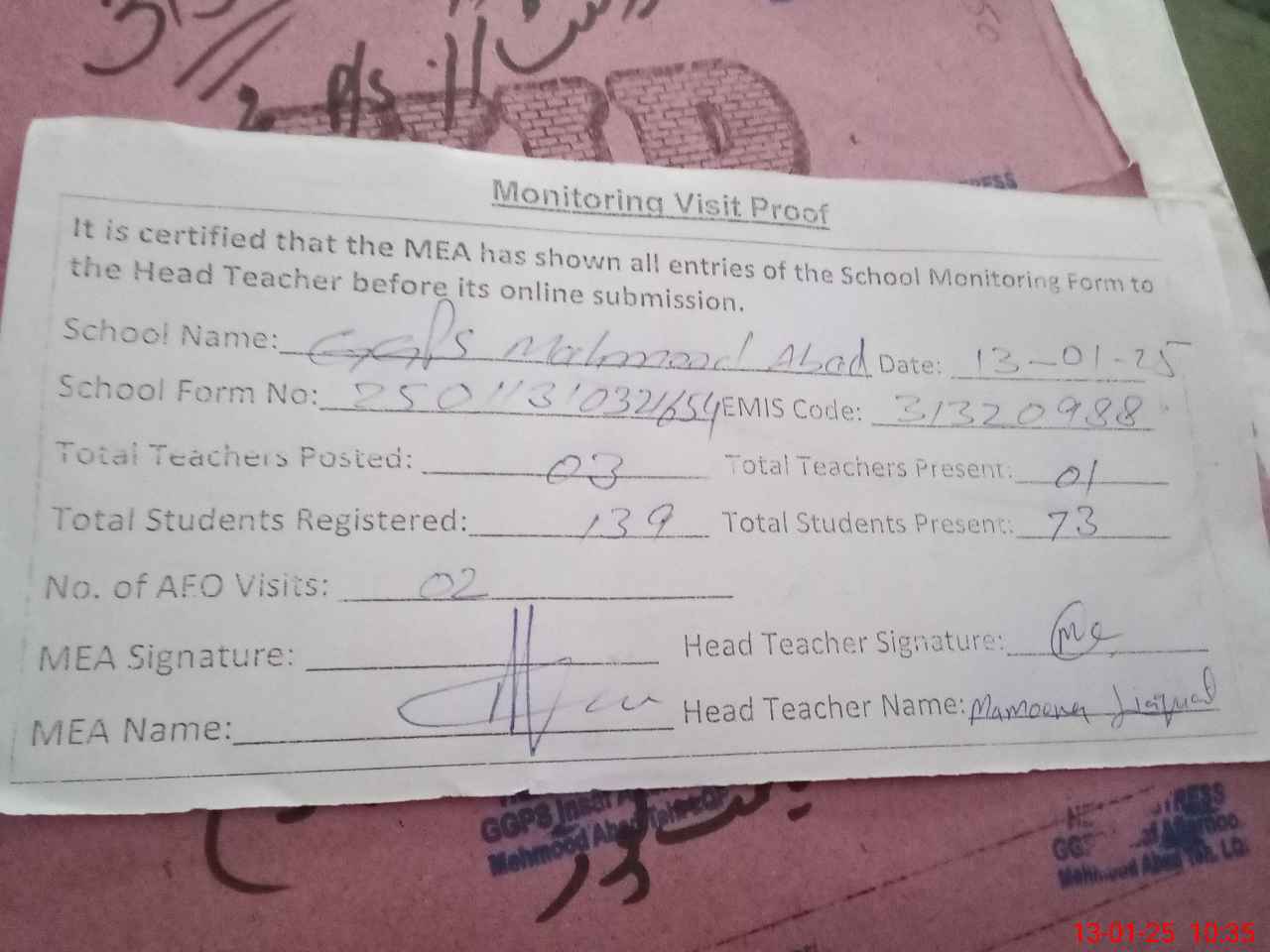| EMIS Code: 31320988 | Name of School: GGPS MAHMOOD ABAD | |||