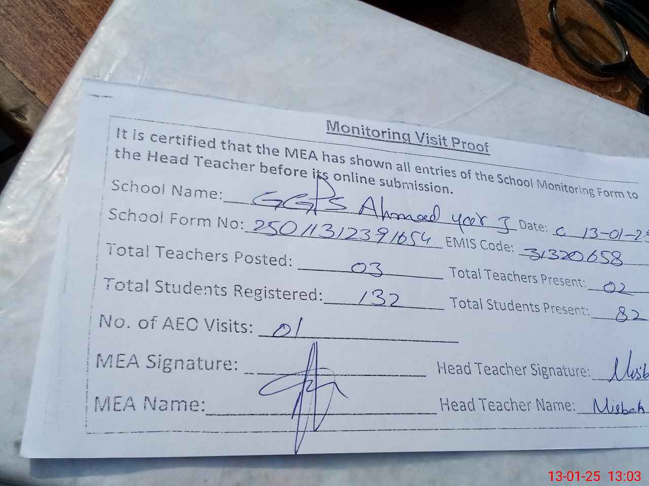 | Attendance Register | Head Teacher | MEA with School | Visit Proof |
