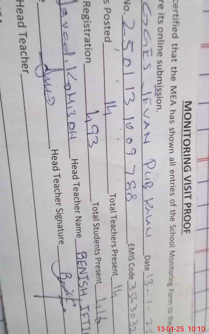 | Name: BE**** IF**** Designation: (School Headmaster's/Headmistress's) SST General Phone/Cell Number: 03**** |