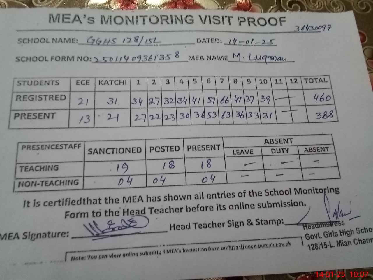 | Certified that this School was Inspected by the Undersigned MEA/DMO Today and the Information Stated Above is as Per Record. | |||||